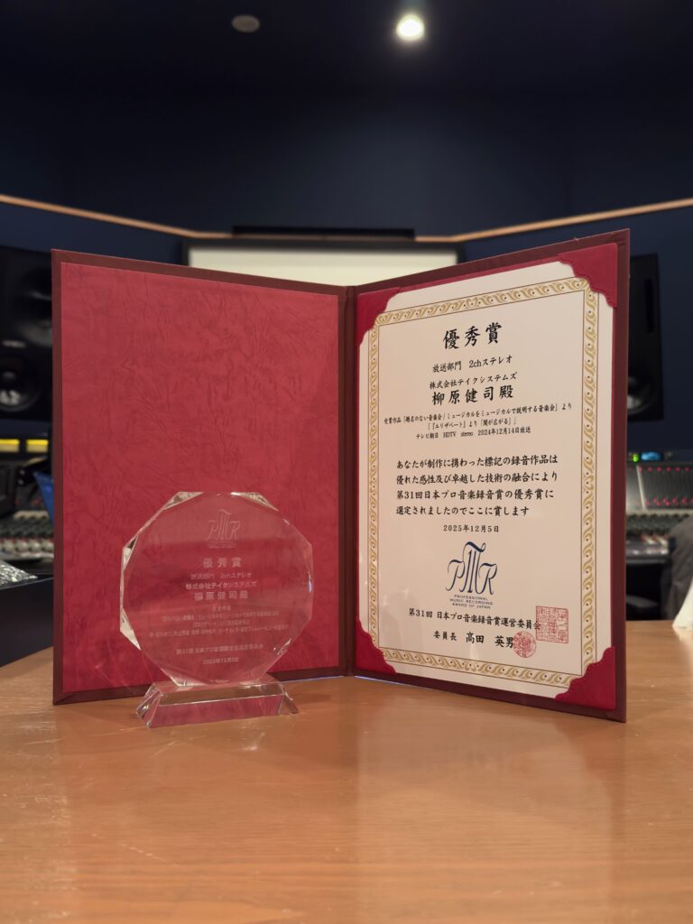第31回日本プロ音楽録音賞 放送部門 2ch ステレオ 優秀賞を受賞しました!!